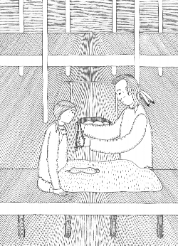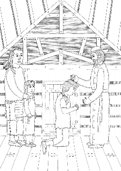 The people of Ossossane worked with the Jesuits' French helpers to build a longliouse for the mission. A Huron longhouse was usually about seven metres wide and twice as long. The walls were made of saplings, standing side by side upright in the ground. They were bent and joined at the top to form a roof with smoke holes about six or eight metres above the earth floor. There were storage bins at the sides and poles along the top for hanging corn and fish. The Jesuits' house was different. It had a wall inside to create a special worship space. In honour of Mary, the mother of Jesus, they called it the chapel of the Immaculate Conception.