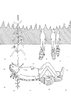 Back in their village the brother had a feast. He danced with his sister's skeleton over his shoulders and one of the pumpkins in each hand. After only a few steps life began to return to her bones. But no one could look while he danced. When someone stared at her the sister fled back to the dead.