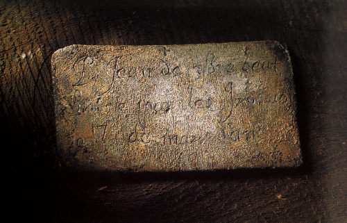 lead plaque, the coffin plate, bearing the name of the saint and the date